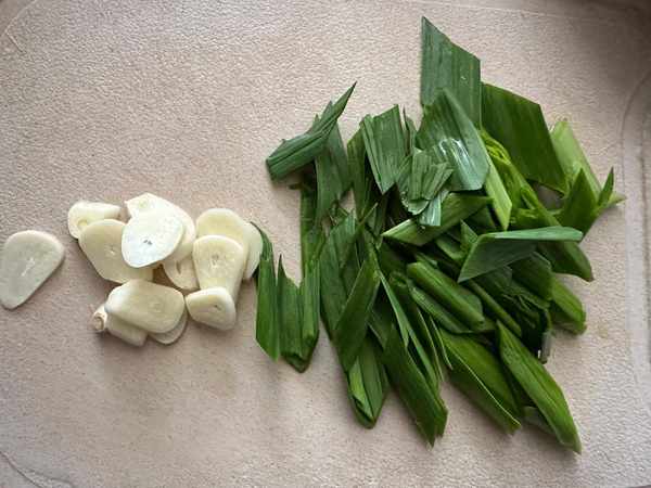 4、锅中热油,加入大蒜和葱白炒出香味;