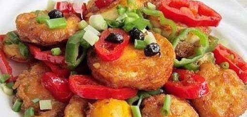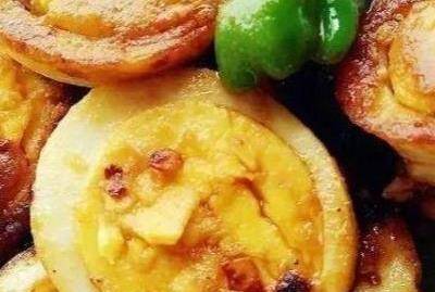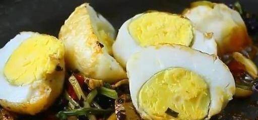 2.煎鸡蛋,直到外皮变黄,起皱并去除,切成两半,在锅中上油,炒大蒜,小辣椒和豆temp,加入老虎皮鸡蛋,加酱油,料酒,糖,加盐搅拌均匀。
