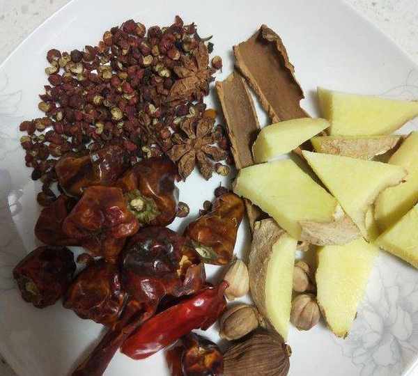 原料:兔子头、花椒、大料、草果、草寇、桂皮、辣椒、姜、盐、老抽、冰糖、老汤。