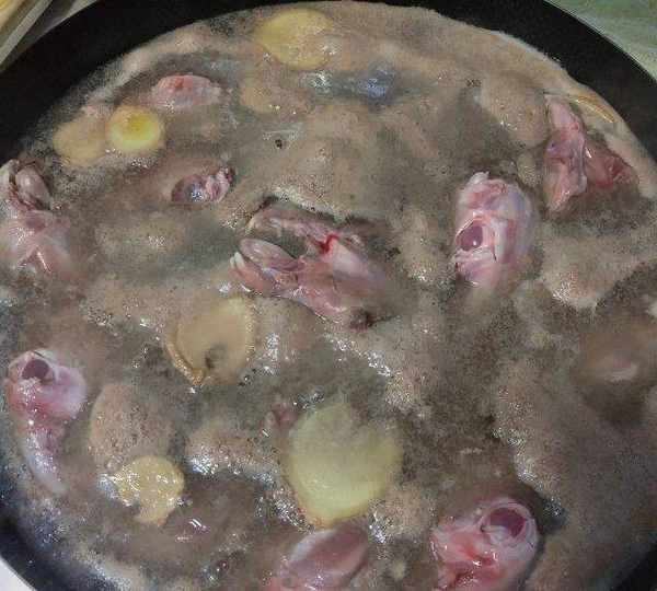 第3步、锅里放冷水,加入姜片和适量的黄酒,放入兔头,大火烧开,将浮沫打去,反复翻动,直至不出浮沫,捞出,用水清洗干净。