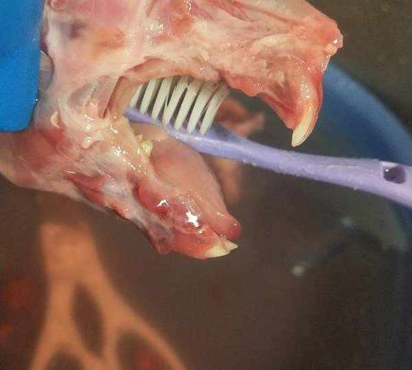 第2步、用剪刀剪去口角边带毛的皮,掰开嘴,用牙刷把牙齿和舌头刷干净,用剪刀剪去边角的淋巴肉和肥油。