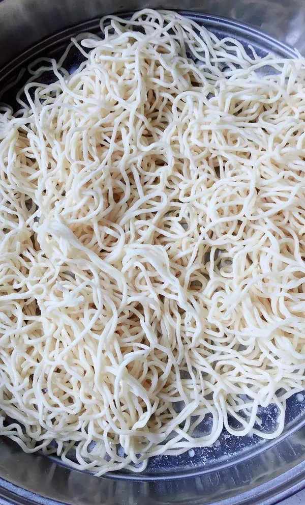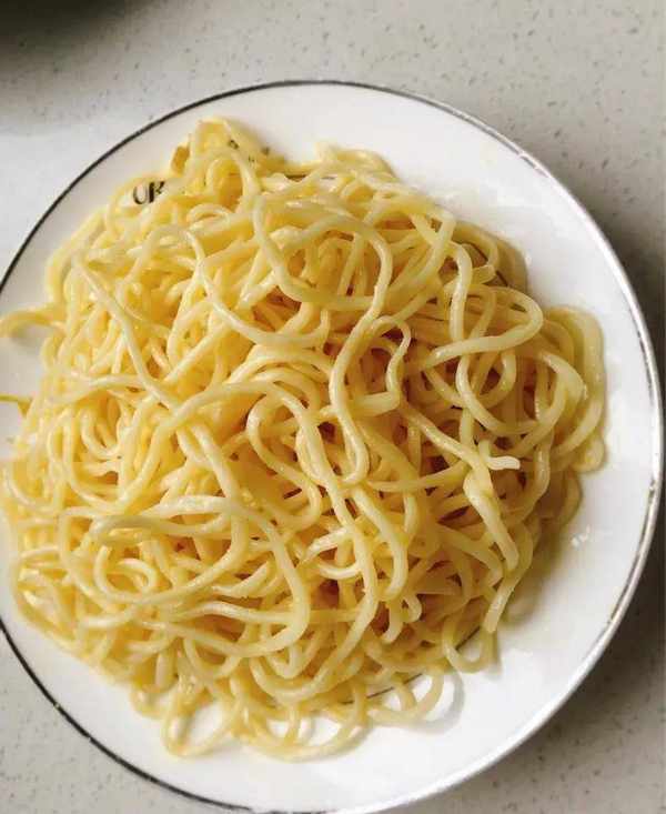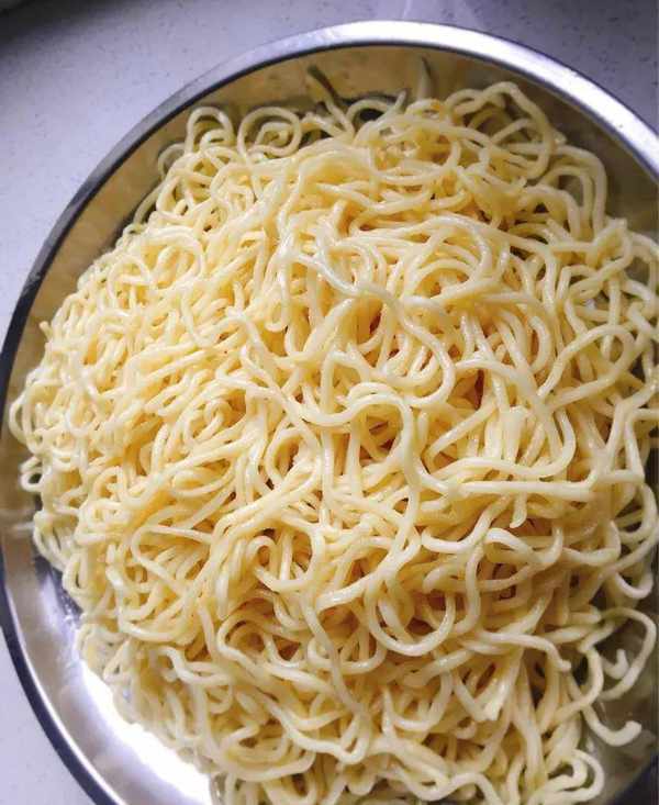 3 锅中再次倒入多一点水,水开把蒸好的面放入,大火把面煮开,煮一分钟即可捞出面条,面条放凉不烫手时,在面条中倒入菜籽油,不喜欢菜籽油可以放其它食用油,把油和面条拌匀,每一根面条都均匀裹上油。