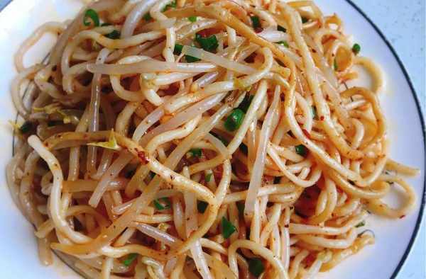 4 开始拌凉面:盘底放豆芽,把面放在豆芽上面,依次放入少许白糖提鲜、少许盐、适量花椒油、适量生抽、多一点陈醋、适量的红油,最后放入葱末