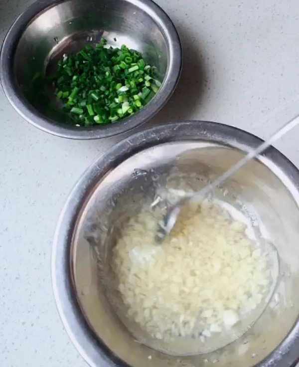 葱、蒜适量,把葱切碎放小碗中备用;蒜切成很碎的蒜末放入小碗中,加入少许盐拌匀腌制一会,加入适量凉开水搅拌成蒜水备用。