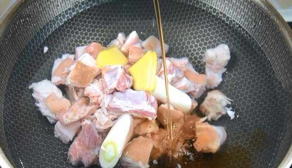 第二步:锅中加入适量的水,将剁好的羊排冷水下锅,下入切好的葱段、生姜片和料酒焯水,焯至羊肉中的血水起沫时,将浮沫打捞干净后,捞出控干水备用。