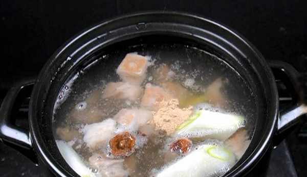 2、 羊排一定要焯一下水,捞出浮末后,将羊肉捞出重新入锅,炖煮40分钟放入萝卜片。