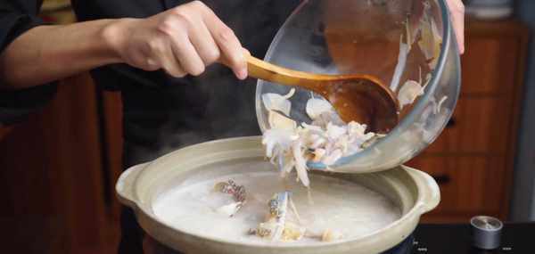 6、这时可以把贝壳和冬菜先下入粥底,让粥底有个基础的鲜味,我认为冬菜是好吃的砂锅粥必不可少的秘密武器,煮3分钟;