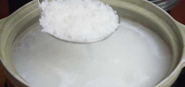 5、30分钟以后,当米粒开花时,将一半的米粒捞出来(这样做主要把米浆煮出来,让粥更浓稠)
