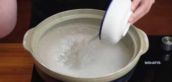 3、砂锅中放入泡好的米和水,米和水的比例是1:7