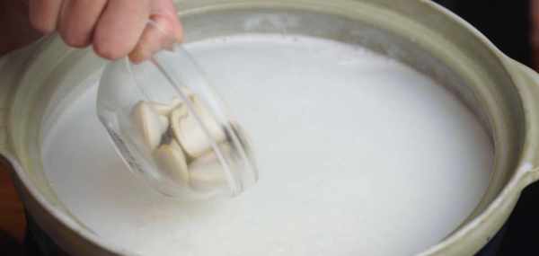 4、小火煮开后加入一小坨猪油(这是粥底顺滑的秘密)盖上盖,小火慢煮30分钟,中途用勺子给它搅动一下防止糊底;