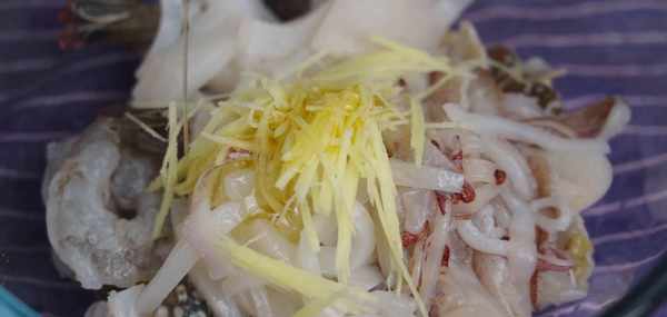 2、海鲜处理好后,加点姜丝、盐和食用油,搅拌均匀备用;