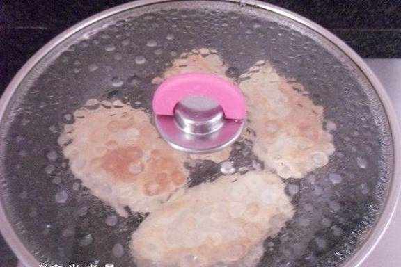 遮上锅盖,小火煎焖片刻,利用水蒸气将饼内的肉馅快速焗熟,水干即可铲起