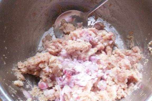 猪肉洗净去皮,切小块,放入搅拌机搅成肉馅,调入盐、葱头碎、酱油、蚝油、香油、鸡粉搅拌均匀,腌制片刻