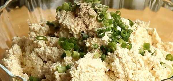 4、把碾碎的豆腐放入萝卜丝里,加入适量的葱花、胡椒粉,搅拌均匀。
