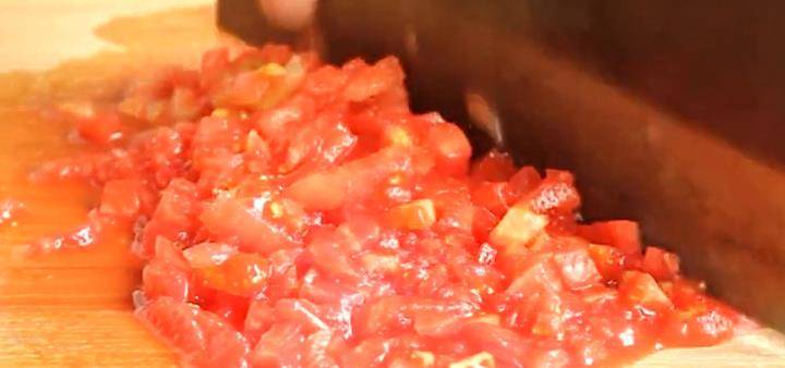 8、西红柿划十字刀,用开水烫一下,去皮,剁碎备用。