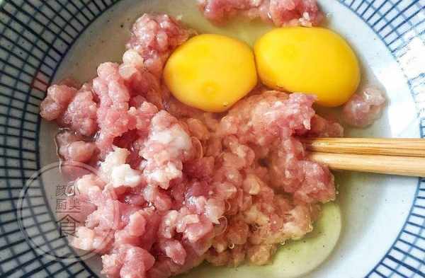 2、打入两个鸡蛋打散,鸡蛋尽量打的细腻点,和肉末搅拌均匀。