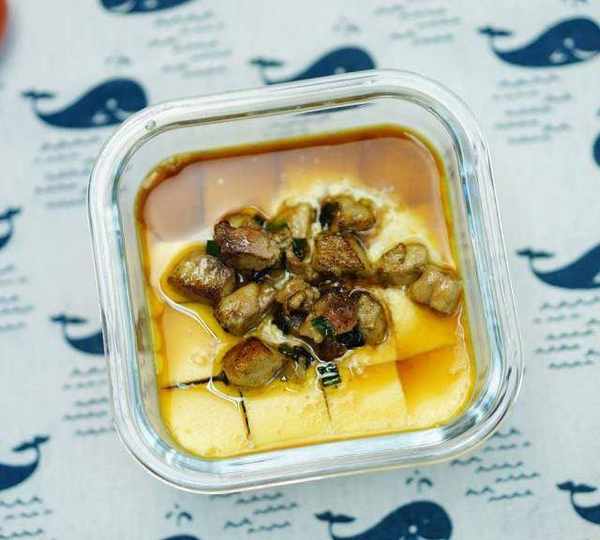第9步、蒸蛋取出,划小块,加入鹅肝和酱油即可。