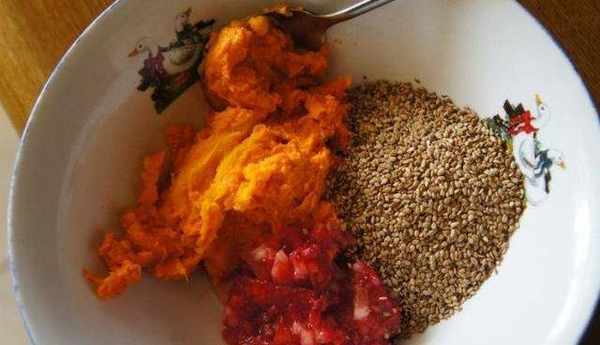 先做馅料:鸡蛋果去皮压成泥,草莓洗净切碎,取大一点的容器,将鸡蛋果肉、草莓碎、芝麻放在一起拌均匀