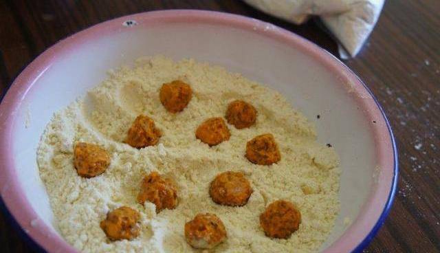 将冷冻的馅料蘸水后放入面粉中,端起盆晃动滚满面粉