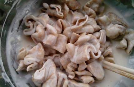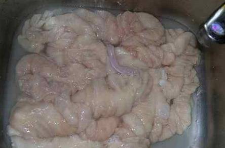 先用面粉和盐搓洗出肠粘质,冲洗干净。再放入白醋反复抓搓,然后洗净,泡一会淘米水。
