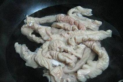 做法:煮熟的猪大肠,下锅汆水,捞出,切成小段。(也可以切好在汆水)