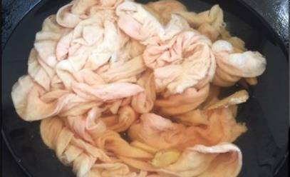 大肠如何清洗:首先先将猪大肠翻肠,内面朝外。