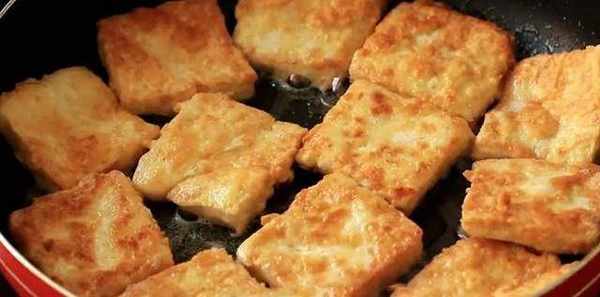 4、起锅放入适量的油,油热5分的时候将裹上蛋液与面粉的豆腐块放入油锅中进行煎炸,用小火慢慢煎,一面煎至金黄后翻面再将另一面煎至金黄即可出锅;