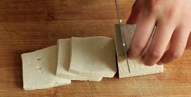 1、准备新鲜的豆腐一块,先将豆腐切成小块备用;