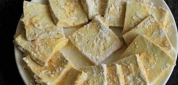 3、将豆腐小块放入搅散了的鸡蛋碗中裹上蛋液,然后再准备一碗面粉,在裹上蛋液后马上放入面粉碗中裹上一层面粉;