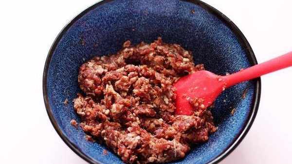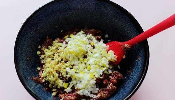 1、将牛肉馅中先加入适量的盐和料酒。