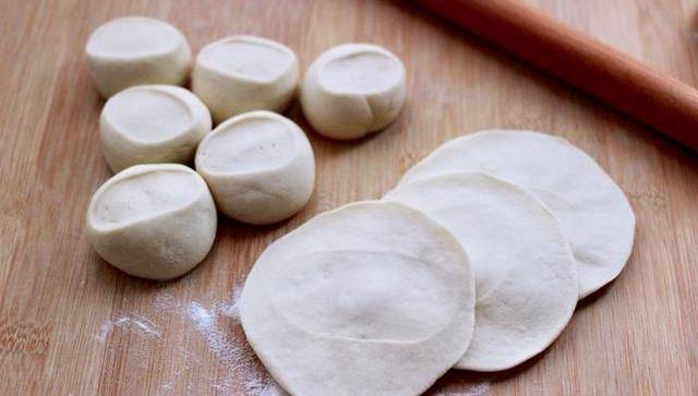 10、把剂子摁扁后,用擀面杖擀成圆形薄面皮。