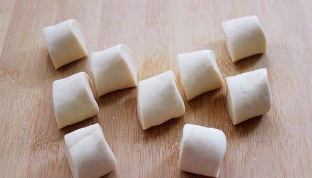 9、把醒发好的面团排气揉匀后,用手搓成长条后,用刀切成大小一致的剂子。