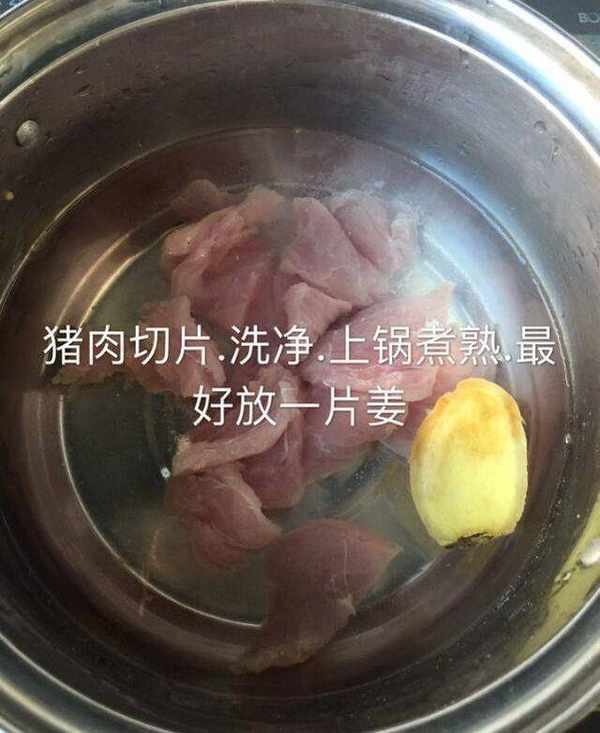 2.猪肉洗净,切片,放锅里煮熟,最好放一片姜
