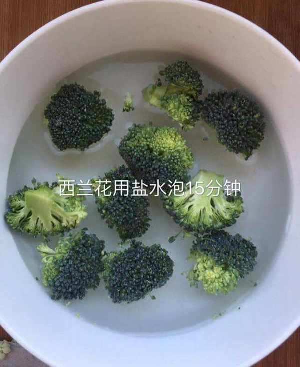 1.西兰花用盐水泡15分钟,洗净捞水