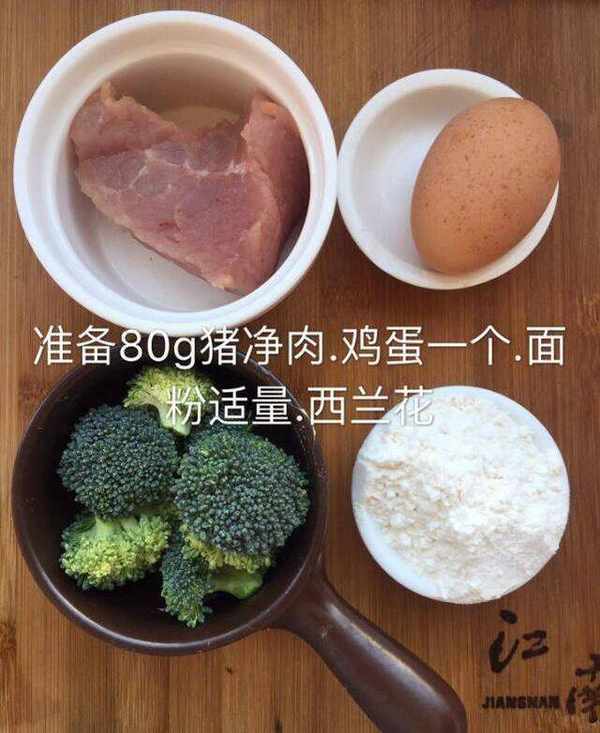 原料:准备猪净肉80克,鸡蛋一个,面粉适量,西兰花适量