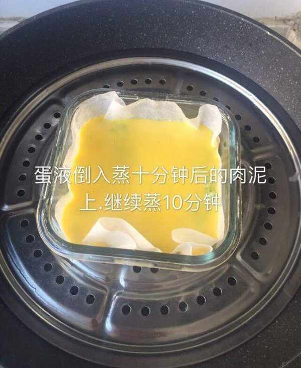 7.搅拌均匀的蛋液倒入蒸十分钟后的肉泥上,继续蒸10分钟