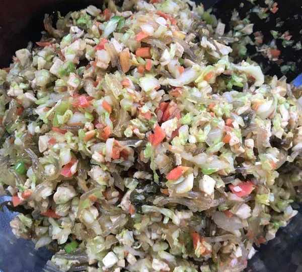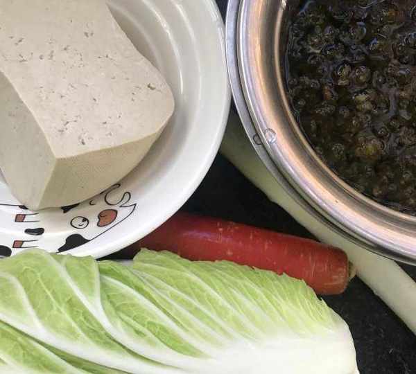 原料:面粉、开水、豆腐、包菜、地软、葱、红萝卜、红薯粉、盐、油、五香粉、姜粉、醋、酱油、辣椒粉、芝麻。