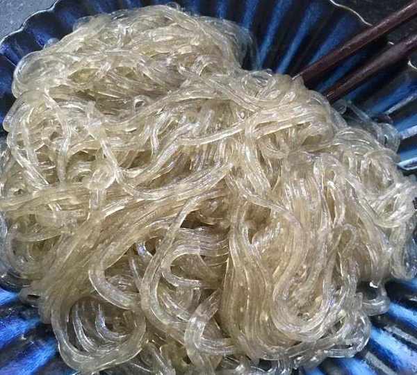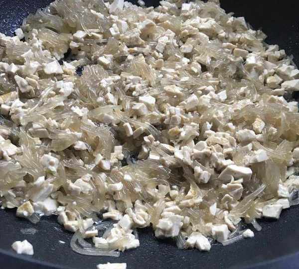 第5步、锅中入油烧热,放入豆腐炒出水汽,粉条切碎放入炒均。