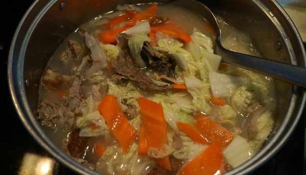 材料:烤鸭架一副,盐少许,姜一块,白菜两片,胡萝卜半根
