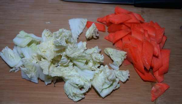 8.切两片白菜和胡萝卜片;