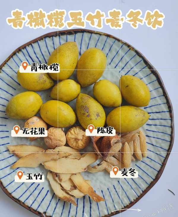 【食材】青橄榄100g(约12-13粒)、玉竹10g、麦冬10g、无花果10g、老陈皮1瓣(约2g)、清水1000ml