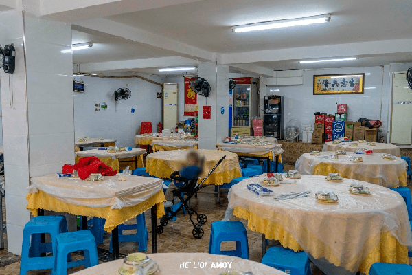 进门感觉整间门店还挺大的,金黄色桌布上,还覆盖了一层一次性桌布,加上白色瓷砖墙与蓝色塑料椅,几乎不加修饰的生活场景,“烟火气息”相当浓厚!