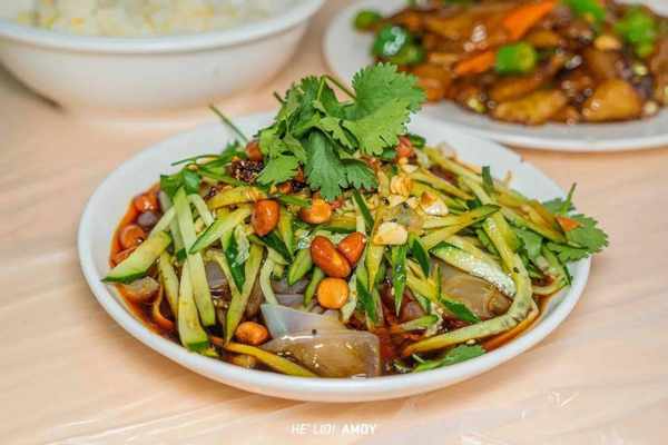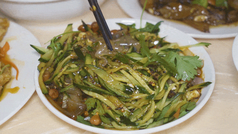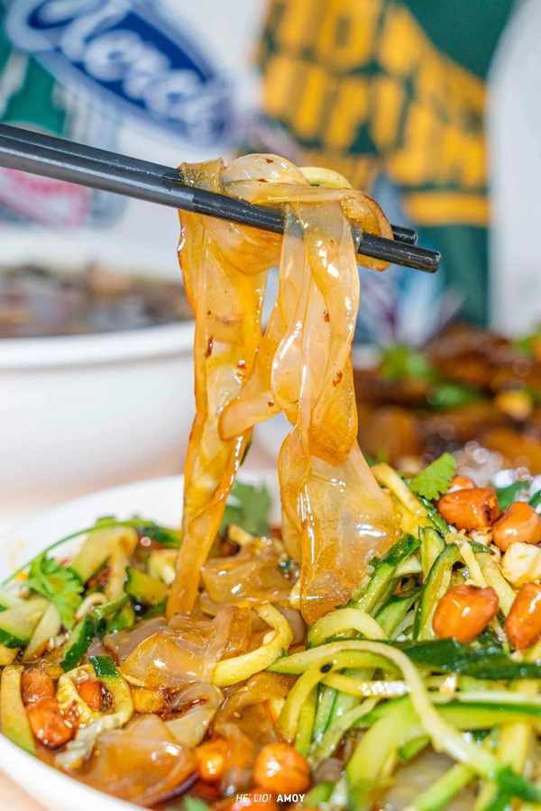 又薄又韧的拉皮清爽中夹杂着微辣,柔韧度绝对满分,筷子一扯,甚至还带着些许弹跳的劲头,大口吃上几口「锅包肉」,再来上几口「大拉皮」,呲溜下肚,别提多带劲了!