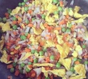 第二步,要把锅烧热后放入猪油,这里推荐用猪油,因为猪油这东西,只要吃过的人都会评价一个字——香!当然,要是没有猪油,用其他食用油代替也是可以的。接着等油温差不多了,将鸡蛋液倒进去炒散。等到它变黄之后,将胡萝卜丁和洋葱丁放进去一起爆炒。