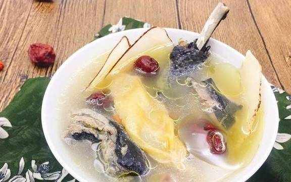 材料:猪脚1只、螺片50g、花胶50g、墨鱼50g、红枣5~6颗、冬菇8朵、木耳20g、盐适量