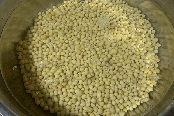 2、泡好后,其实是可以直接拿来打豆浆的,口感也还可以,但是残渣会比较多,不那么细腻,因此我们要多加1小步。锅子里加水,完全煮沸以后,将黄豆倒入其中,煮到黄豆脱皮为止。