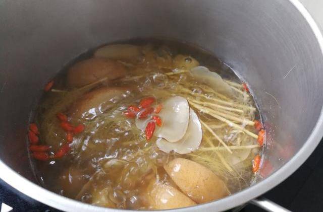 取一个汤煲,把除枸杞子外的材料全放进锅内,大火烧开,再转小火煮