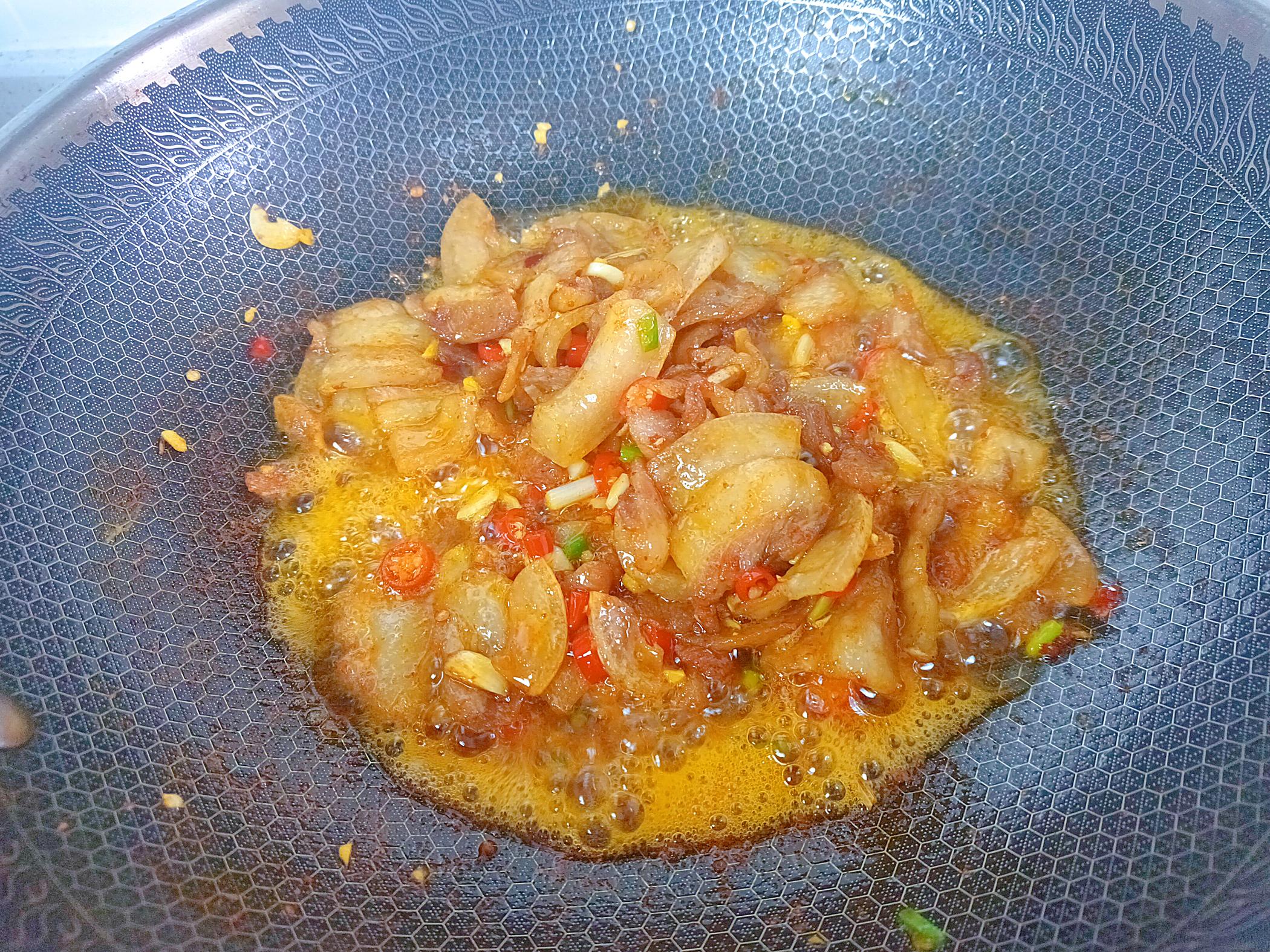 2、五花肉炒好后加姜蒜小米椒爆香,再来一勺豆瓣酱炒出红油。