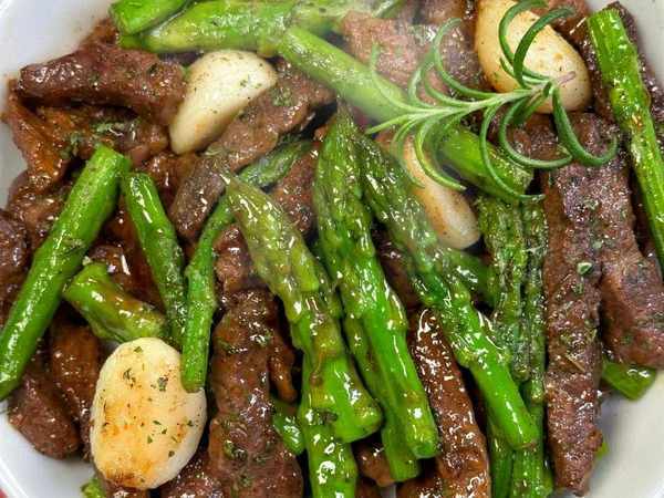4.煸出香味后,再放入芦笋一起翻炒几下,接着倒入牛肉一起翻炒均匀,然后加入适量的生抽、蚝油和黑胡椒提鲜,继续翻炒入味,最后撒入一把欧芹碎点缀,即可出锅开吃。