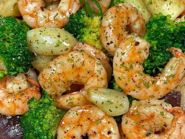 食材准备:大虾、西兰花、香菇、蒜瓣、姜丝、葱段、欧芹碎、蒜米。